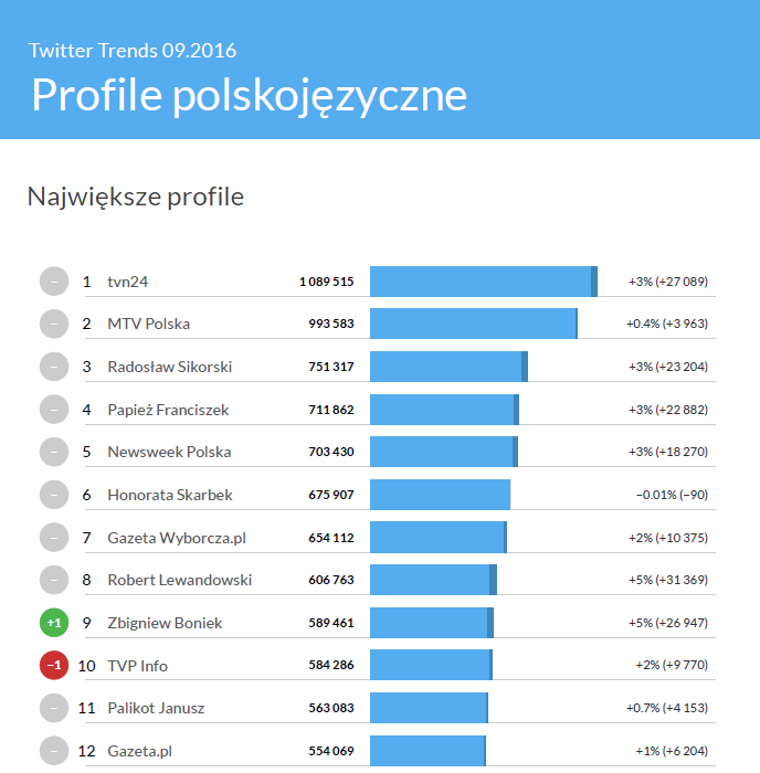 Wśród największych polskich profili na Twitterze mamy jedną roszadę. Profil Zbigniewa Bońka, wybitnego piłkarza i prezesa PZPN we wrześniu zaczęło obserwować 27 tysięcy nowych użytkowników. W efekcie Boniek awansował na 9. miejsce w rankingu, spychając o jedno oczko w dół profil TVP Info.