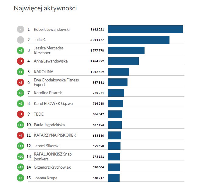 Stagnacja z pewnością nie dosięgnie jednak kategorii Osoby (poza Robertem Lewandowskim i Julią K., oczywiście), w której rotacja miejsc jak zwykle jest ogromna. Przykładowo profil RAFAL JONKISZ Snap joonkers wskoczył o 20 pozycji wyżej względem ostatniego wydania Instagram Trends. Zaraz za nim, jeśli chodzi o szybkie wzrosty aktywności, biegnie pomocnik Paris Saint-Germain – Grzegorz Krychowiak, który plasuje się teraz na 14 miejscu po sprincie w górę o 15 oczek.