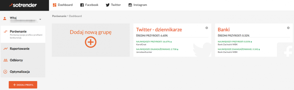 • Porównanie – jeśli chcesz porównać swój profil z profilami konkurencji lub porównać kilka własnych profili między sobą, utworzyć grupy profili i analizować najważniejsze metryki,
