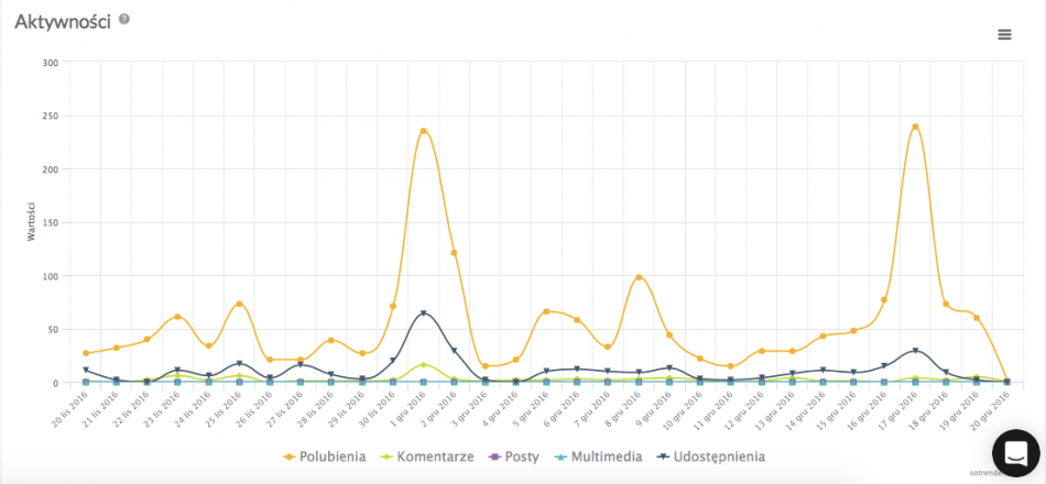 Aktywność fanów w podziale na dni. Kliknięcie na dany punkt wykresu pozwala na zobaczenie opublikowanych postów.