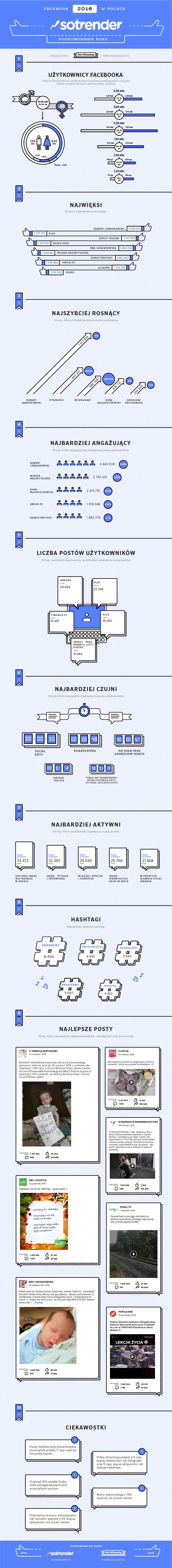 Co jakiś czas słychać kolejne przepowiednie, że czas Facebooka dobiega właśnie końca. Gdy jednak spojrzymy na dane, widać trend odwrotny. Na Facebooku nie tylko rejestruje się coraz więcej użytkowników – w Polsce ich liczba zwiększyła się o niecałe dwa miliony – ale także staje się coraz ważniejszym kanałem reklamowym dla marek. W 2016 roku to właśnie ten kanał był najszybciej rosnącym obszarem reklamy w internecie. Jak zatem wyglądał Facebook w minionym roku w Polsce? Dowiecie się tego z naszej infografiki, którą przygotowaliśmy wspólnie z Panem Wizualnym.