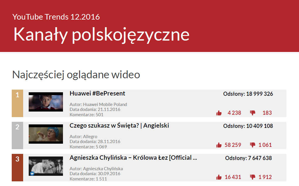 Wielką furorę na YouTube zrobiły w grudniu dwie świąteczne reklamy Huawei i Allegro, które znalazły się na samym szczycie zestawienia najpopularniejszych wideo miesiąca. Zostały wyświetlone odpowiednio prawie 19 i ponad 10 milionów razy. Nic dziwnego, obie wykorzystują magię świąt i grają na emocjach. Co ciekawe, w dziesiątce najpopularniejszych filmów miesiąca znalazła się jeszcze jedna reklama Huawei.