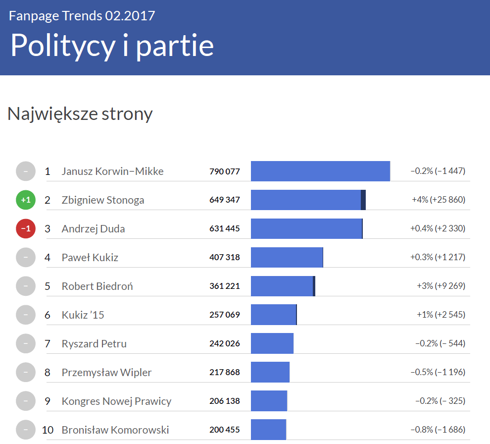 Największe strony w kategorii Politycy i partie – Fanpage Trends luty 2017