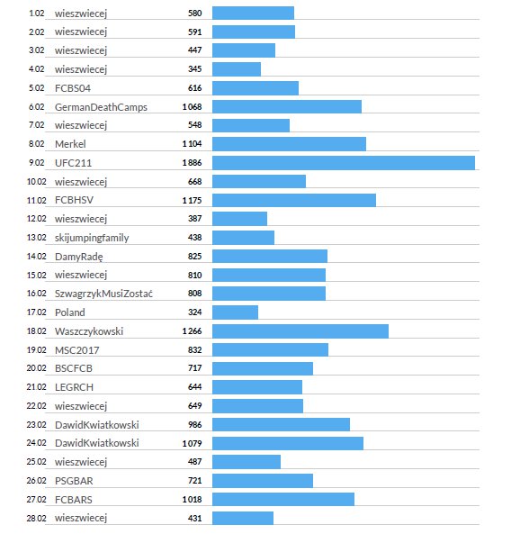 Oczywiście nie można zapominać, że na Twitterze aż roi się od kibiców piłki nożnej, co zdecydowanie można zauważyć po najpopularniejszych tweetach w danych dniach miesiąca. W lutym były to #FCBS04 (Bayern Monachium vs FC Schalke), #FCBHSV (Bayern Monachium vs Hamburg SV), #BSCFCB (Hertha Berlin vs Bayern Monachium) oraz #LEGRCH (Legia Warszawa vs Ruch Chorzów) – jak widać na polskim Twitterze jest dość sporo fanów niemieckiej ligi.