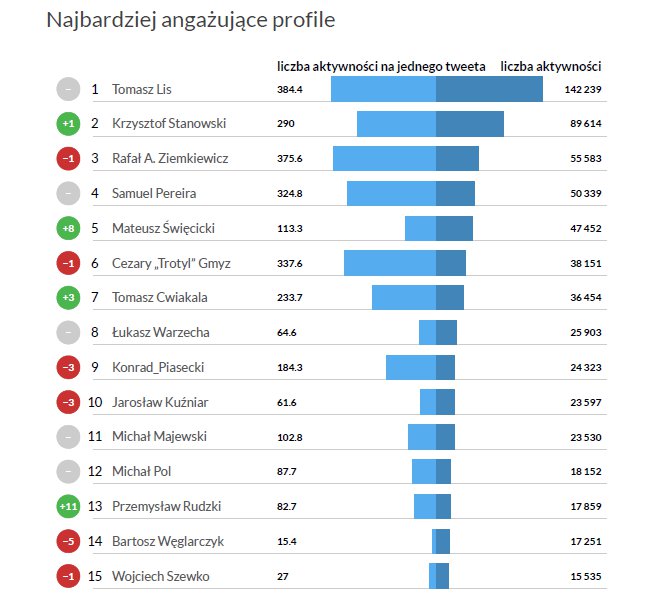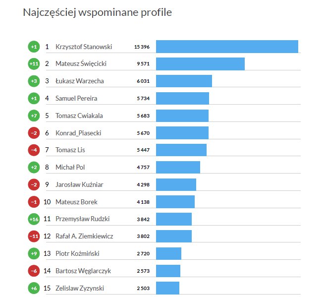Choć wśród dziennikarzy największe profile raczej się nie zmieniają i na podium możemy zobaczyć Tomasza Lisa, Jarosława Kuźniara i Mateusza Borka, to już wśród najbardziej angażujących i najczęściej wspominanych profili możemy zaobserwować spore zmiany w każdym miesiącu. Na szczególne uznanie (dzięki skokom o czasem nawet kilkadziesiąt oczek) zasługuje w lutym Mateusz Święcicki – którego znaleźć można wysoko w stawce nie tylko w kategorii Dziennikarze, ale też Profile polskojęzyczne (miejsce 11) i Ludzie (miejsce 8)
