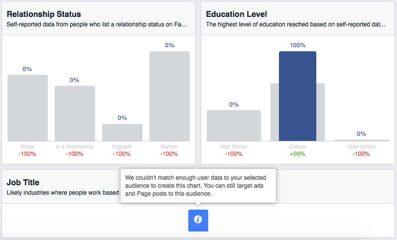 Przez Audience Insights nie można sprawdzić zupełnie dowolnej grupy. Informacje uzyskać można jedynie o Fanach własnych Stron, tylko od 18 lat wzwyż, a grupa musi być wystarczająco duża. Dodatkowo prezentowane kategorie są standardowe i nie zawsze będą odpowiedzią na nasze zapotrzebowania.