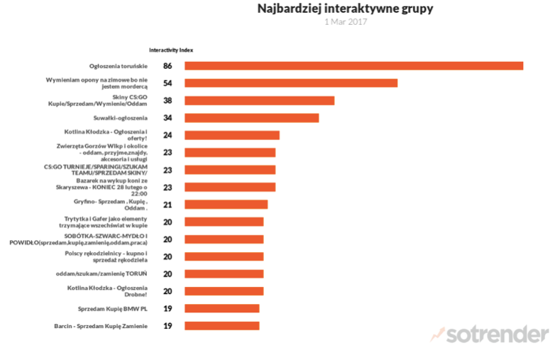 Dodatkowych ciekawostek, zwłaszcza dla branży e-commerce, platform aukcyjnych czy chociażby szkół, może dostarczyć również badanie Facebookowych Grup. Kupię/sprzedam/wynajmę, sportowe, humorystyczne, edukacyjne czy te przeznaczone dla graczy – grupy rosną w popularność.