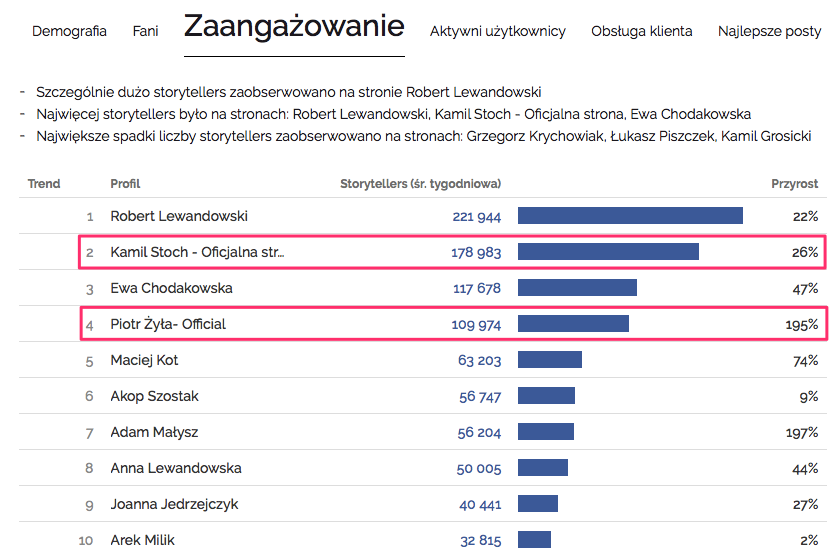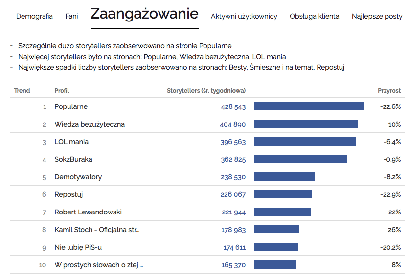 W raportach Facebook Trends Zaangażowanie to od dziś średnia tygodniowa liczba storytellers (czyli użytkowników, którzy skomentowali, udostępnili lub zostawili reakcję pod postem strony z uwzględnieniem tzw. nieopublikowanych/dark postów, czyli treści nie pojawiających się na osi czasu strony). Zestawienie Najbardziej interaktywne strony zamieniliśmy na Aktywnych użytkowników, w którym uwzględniamy Interactivity Index (nasz autorski wskaźnik, który przypisuje różne wagi poszczególnym aktywnościom na Facebooku) oraz liczbę użytkowników zaangażowanych w komunikację strony.