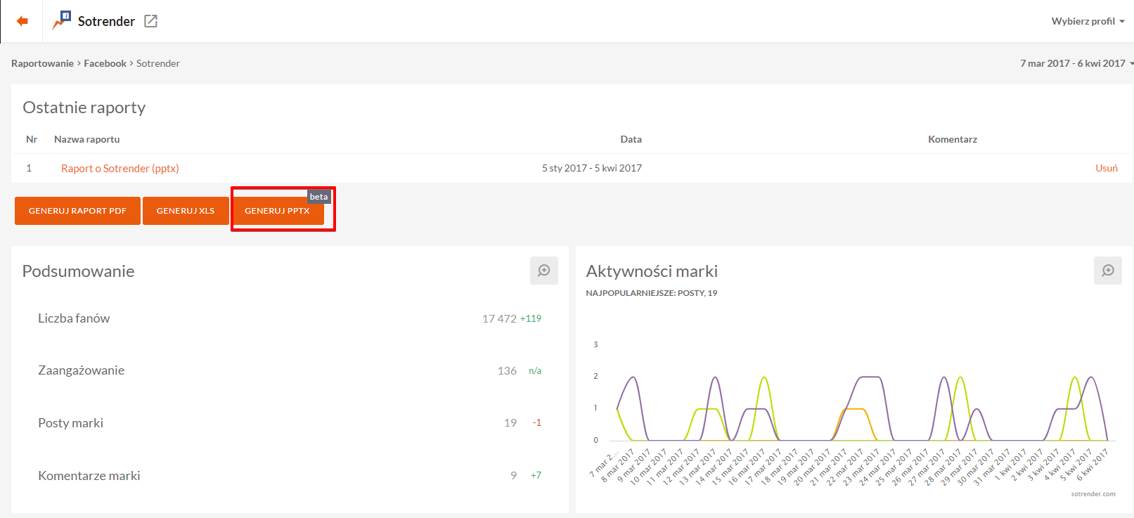Raporty .pptx generuje się dokładnie w tym samym miejscu, w którym tworzycie raporty .pdf. Wystarczy, że przejdziecie do panelu Raportowanie, wybierzecie interesującą Was stronę na Facebooku, ustawicie pożądany zakres dat i klikniecie przycisk Generuj PPTX. Raport zacznie się generować i po kilku chwilach (w zależności od rozmiaru profilu, proces może zająć do kilku minut) będzie gotów!