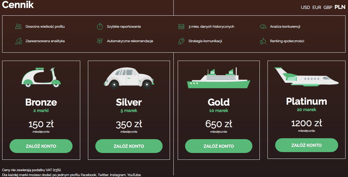 Najmniejszy pakiet, Bronze, to od dzisiaj 2 marki za 150 zł netto. Zrezygnowaliśmy z pojedynczego pakietu, bo jedną z kluczowych zalet Sotrendera jest możliwość porównywania się z konkurencją. Pakiet Silver to od dziś 5 marek za 350 zł, Gold – 10 marek za 650 zł miesięcznie. Nie zmienia się pakiet Platinium. Jeśli 20 marek to dla Was ciągle za mało, napiszcie do nas na sales@sotrender.com, na pewno znajdziemy rozwiązanie.