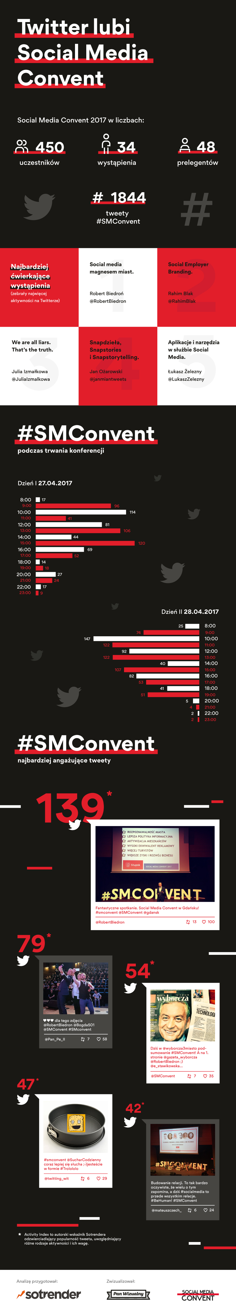 W tym roku Social Media Convent, jedna z największych i najlepszych konferencji poświęconych social media w Polsce, odbyła się po raz piąty. Sotrender jak zawsze był obecny w Gdańsku – dowiedzieliśmy się ciekawych rzeczy, a Hubert Tworkowski opowiedział o tym, jak budować dobre relacje z klientami. Postanowiliśmy sprawdzić, jak wyglądała tegoroczna edycja na Twitterze: które prezentacje były najszerzej komentowane, kto wysłał najlepsze tweety i ile razy w ciągu dwóch dni trwania konferencji ćwierkano, używając oficjalnego hashtaga konferencji #SMConvent. Wszystkie dane zwizualizował dla Was Pan Wizualny.