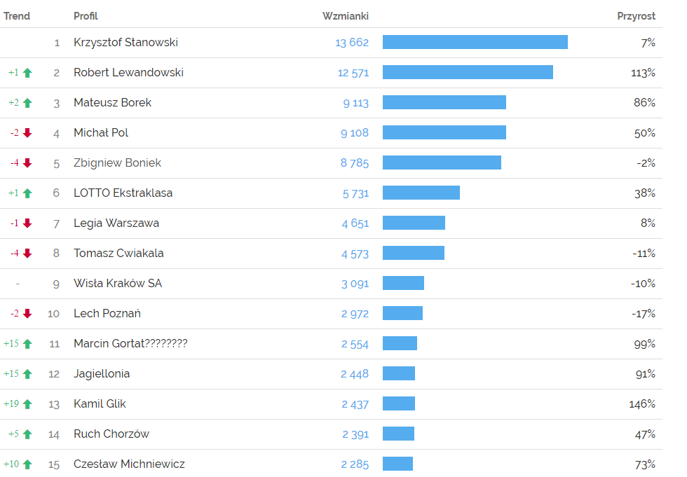 Przygotowanie raportów w nowej formie, wiąże się także z ich rozszerzeniem. W raportach w ubiegłym miesiącu zadebiutowała kategoria Sport. Oczywiście, jej liderem jest Robert Lewandowski, ale ma zaledwie 13 tys. obserwujących więcej niż Zbigniew Boniek. Zawodnik Bayernu Monachium był także najczęściej wspominanym sportowcem w ubiegłym miesiącu (ale osobą związaną ze sportem, którą twitterowicze wspominali najczęściej jest redaktor naczelny Weszło! Krzysztof Stanowski), co jest awansem o dwa miejsca w stosunku do marca. Czyżby było to wynikiem zapewnienia sobie przez Bayern piątego mistrzostwa Niemiec z rzędu na trzy kolejki przed końcem sezonu?