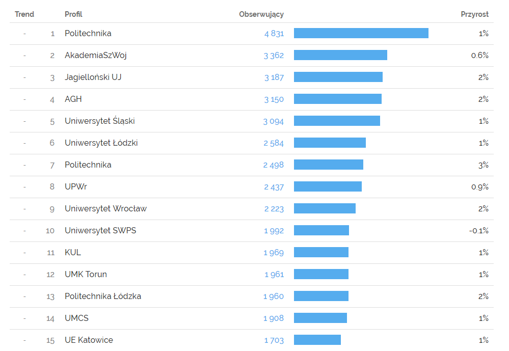Inna nowa kategorią w odświeżonych raportach Twitter Trends są Uczelnie wyższe. Najpopularniejszym profilem w tej kategorii jest Politechnika Wrocławska przed Akademią Sztuki Wojskowej oraz Uniwersytetem Jagiellońskim. Warto zauważyć, że Politechniki są bardzo mocne na Twitterze – najczęściej wspominaną uczelnią w kwietniu była Politechnika Wrocławska, a najwięcej aktywności zebrały tweety Politechnik Wrocławskiej i Warszawskiej.