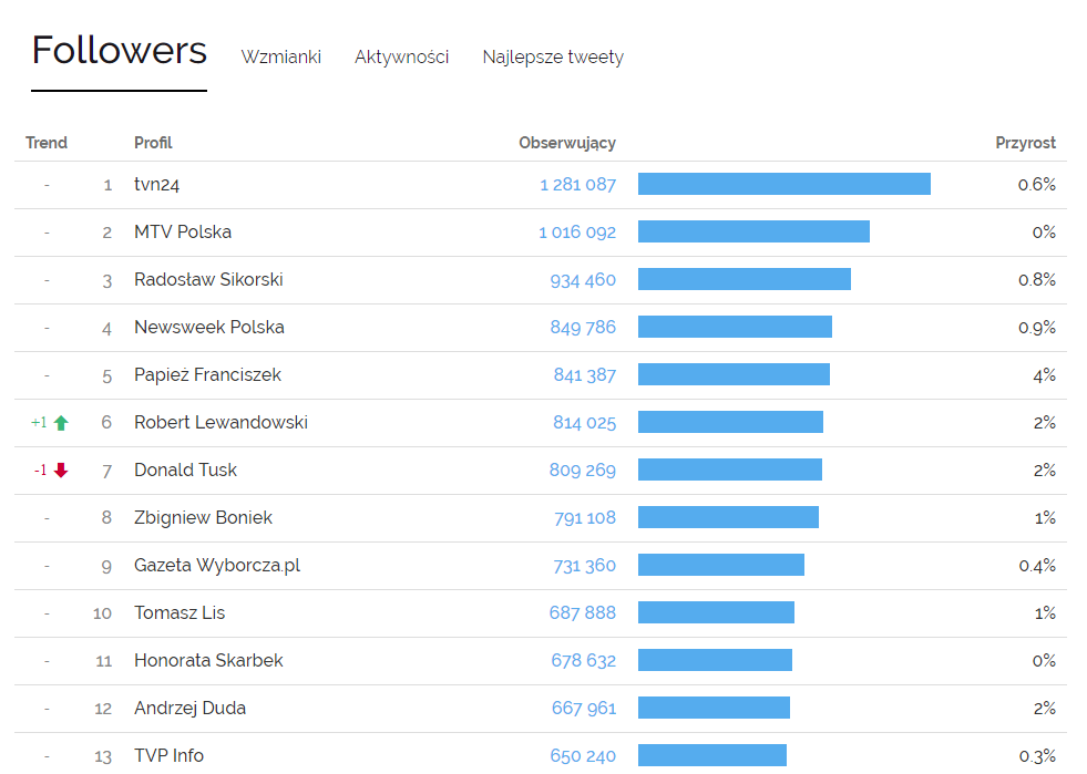 Najpopularniejszym polskim kontem na Twitterze pozostaje profil tvn24 z ponad 1,1 milionów obserwujących. Również milion obserwujących przekroczył profil MTV. Robertowi Lewandowskiemu trochę brakuje do tej liczby, ale w ubiegłym miesiącu udało mu się prześcignąć w rankingu przewodniczącego Rady Europejskiej – Donalda Tuska i uplasował się na miejscu szóstym naszego zestawienia, tuż za polskojęzycznym kontem papieża Franciszka.