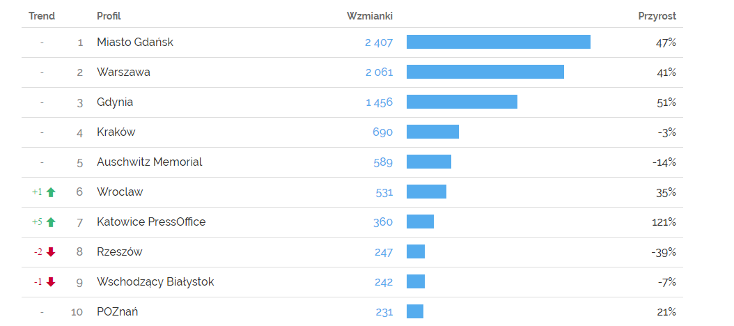 Powoli zbliża się okres wakacyjnych wyjazdów, na pewno wielu z Was wyjeżdżało na majówkę, dlatego postanowiliśmy przyjrzeć się dokładniej kategorii Miejsca w Twitter Trends. Najpopularniejszym profilem w tej kategorii jest oficjalne konto Warszawy przed profilem Kuturalna Warszawa oraz Wrocławia. Zaraz za podium znajduje się oficjalny profil Muzeum Auschwitz. Ten profil opublikował także najwięcej najlepszych tweetów w ubiegłym miesiącu. Natomiast twitterowicze najczęściej wspominali profil Miasto Gdańsk, czyli oficjalną reprezentację stolicy Pomorza na Twitterze.