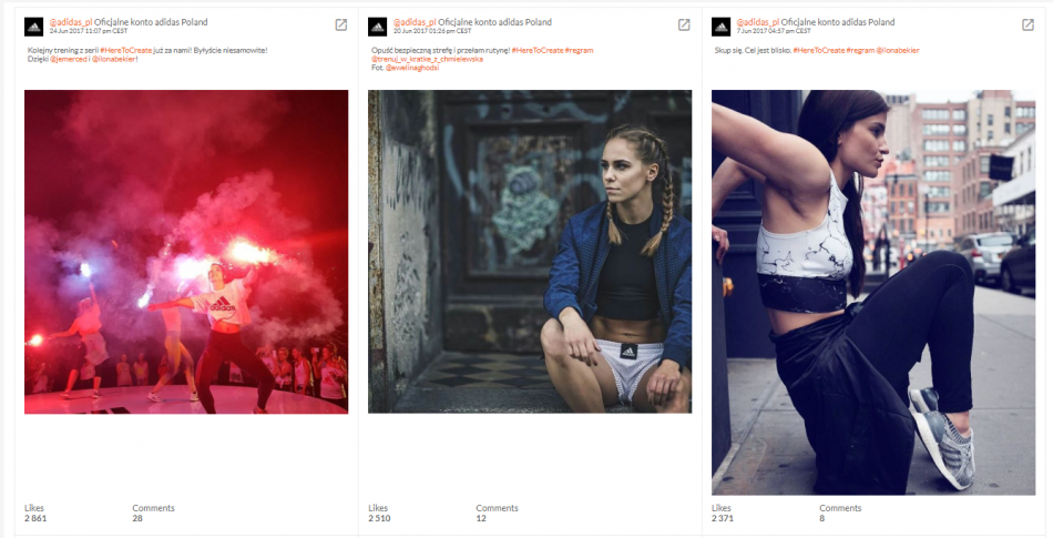 Dzięki temu oficjalny profil Adidasa angażował swoje fanki bardziej niż w poprzednim miesiącu, a najlepsze posty w czerwcu dotyczyły właśnie eventów #HereToCreate.