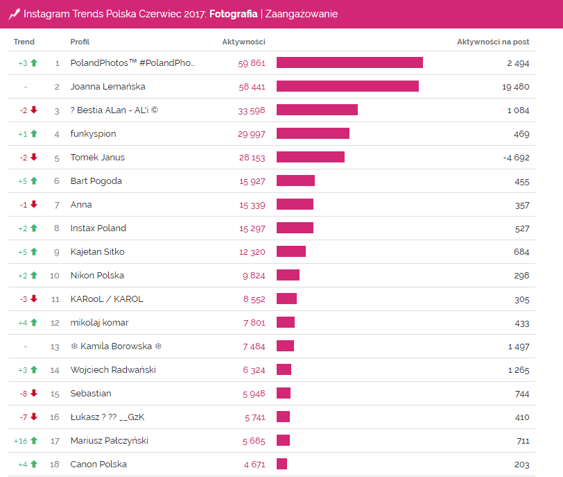 Którzy fotografowie odnotowali największe wzrosty? Mariusz Pałczyński (fotografia sportowa i eventy) Bartpogoda oraz Kajetan Sitko (fotografia podróżnicza). Na pierwszym miejscu w zestawieniu znalazł się profil PolandPhotos (który jak się okazuje jest na sprzedaż), prezentujący różne zakątki naszego kraju. Dość dużym zainteresowaniem cieszyły się również profile marek związanych z fotografią i sprzętem fotograficznym, np. Instax Poland, Nikon Polska czy Canon Polska, które odnotowały wzrosty o kilka pozycji.