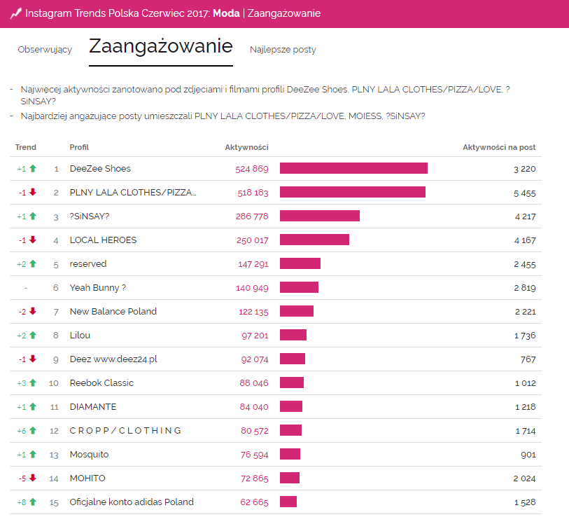 Instagram Trends Polska Czerwiec 2017: Moda | Zaangażowanie