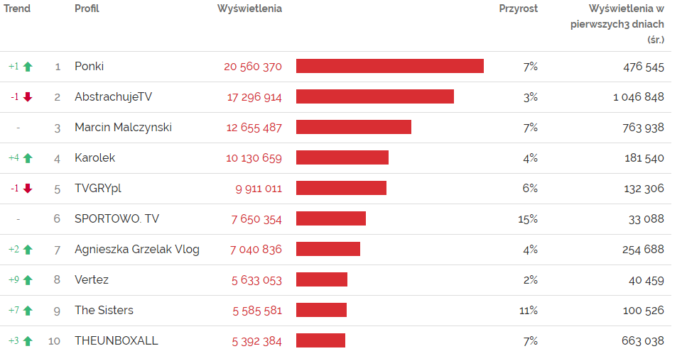 A skoro padła nazwa Abstrachuje, przyjrzyjmy się, jak wyglądała vlogosfera w czerwcu. Najchętniej oglądanym kanałem w kategorii vlogi i youtuberzy był Ponki, którzy w ubiegłym miesiąc z ponad 20 milionami wyświetleń wyprzedzili wspomnianych Abstrachujów i Marcina Malczyńskiego, którzy w czerwcu zanotowali odpowiednio 17 i 12 milionów wyświetleń.