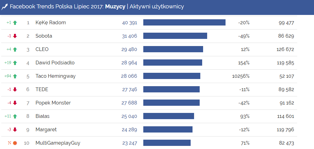 W tym miesiący postanowiliśmy bliżej przyjrzeć się muzykom na Facebooku. Najpopularniejsi są niezmiennie Kamil Bendarek i CLEO, którzy mają ponad milion fanów. Zaraz za nimi znajduje się pokaźna reprezentacja raperów – Sobota, Pezet, OSTR i Grubson. Jednak, gdy przyjrzymy się najbardziej angażującym muzykom, ukaż się zgoła inny obraz. Najwięcej aktywnych użytkowników w lipcu było na stronie KęKę, radomskiego rapera, choć ubyło mu ich 20%. Największy przyrost zaangażowanych użytkowników miała strona Taco Hemingwaya, warszawskiego rapera, który pod koniec lipca po miesiącach milczenia wypuścił nowy album.