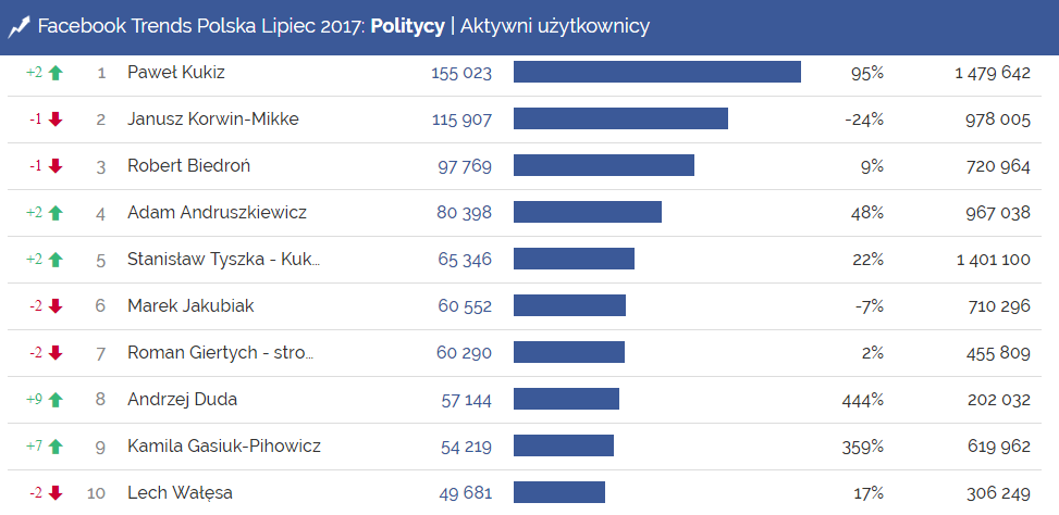 Od polityki w lipcu nie dało się uciec również na Facebooku. Choć to medium dużo mniej upolitycznione niż Twitter, wśród najlepszych postów miesiąca znalazło się kilka poświęconych protestom przeciwko reformie sądownictwa, czy postulowanej podwyżce podatku na paliwa – te dwa tematy budziły w ubiegłym miesiącu najwięcej emocji. Podobnie, jak na Twitterze na fali protestów najbardziej skorzystała jedna z jego liderek, posłanka Nowoczesnej, Kamila Gasiuk-Pihowicz. W lipcu przybyło jej 48% fanów, dzięki czemu jej strona awansowała o sześć miejsc w zestawieniu najpopularniejszych polityków na Facebooku, wyprzedzając m.in. Barbarę Nowacką, Radka Sikorskiego czy profil Lecha Kaczyńskiego. W rankingu pod względem liczby aktywnych użytkowników, strona Gasiuk-Pihowicz uplasowała się na miejscu dziewiątym w swojej kategorii. Warto także zwrócić uwagę na awans w tej samej kategorii, strony Andrzeja Dudy, który po trochę słabszym okresie na Facebooku, wraca do czołówki najbardziej angażujących polityków.