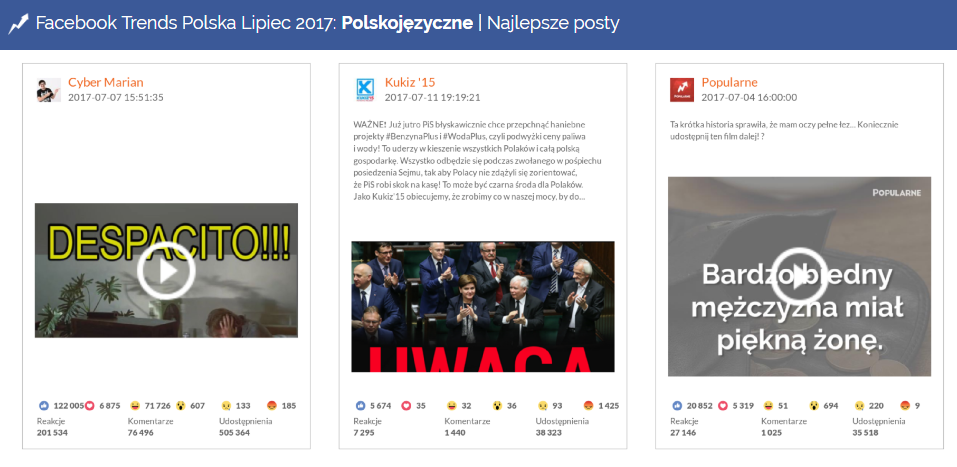 Najlepszy post lipca został udostępniony ponad pół miliona razy, co jest absolutnym rekordem w historii naszych raportów. To krótkie, półminutowe wideo, które demonstruje za pomocą Chucka Norrisa przesyt “Despacito”. Kreatywny pomysł, wykorzystanie ikony popkultury, chwytliwy i aktualny temat, czyżby to była idealna metoda na sukces? W przypadku Cyber Mariana sprawdziła się idealnie – 200 tysięcy reakcji, 76 tysięcy komentarzy, pół miliona udostępnień i awans o 1176 (!) miejsc rankingu zaangażowania mówi samo za siebie.