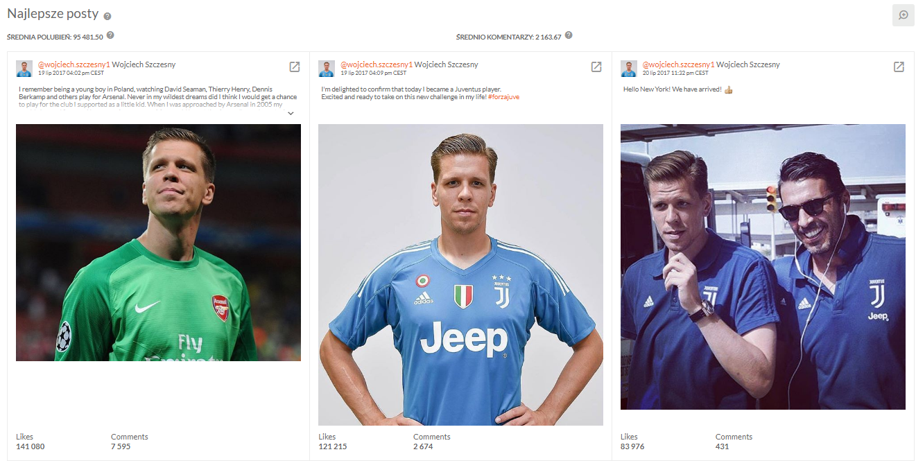 Choć wydaje się, że długo jeszcze będziemy musieli czekać aż komuś naprawdę uda się przyćmić sławę Roberta Lewandowskiego (ponownie należą do niego najlepsze posty miesiąca jak i dominacja pod względem liczby obserwatorów), od pewnego czasu inni polscy piłkarze zaczynają “dochodzić do głosu”. Jednym z nich jest Wojciech Szczęsny, który w minionym miesiącu został piłkarzem klubu Juventus. Transfer ten zapewnił mu również 8% przyrost obserwatorów na Instagramie, plasując go na 5. pozycji w rankingu.