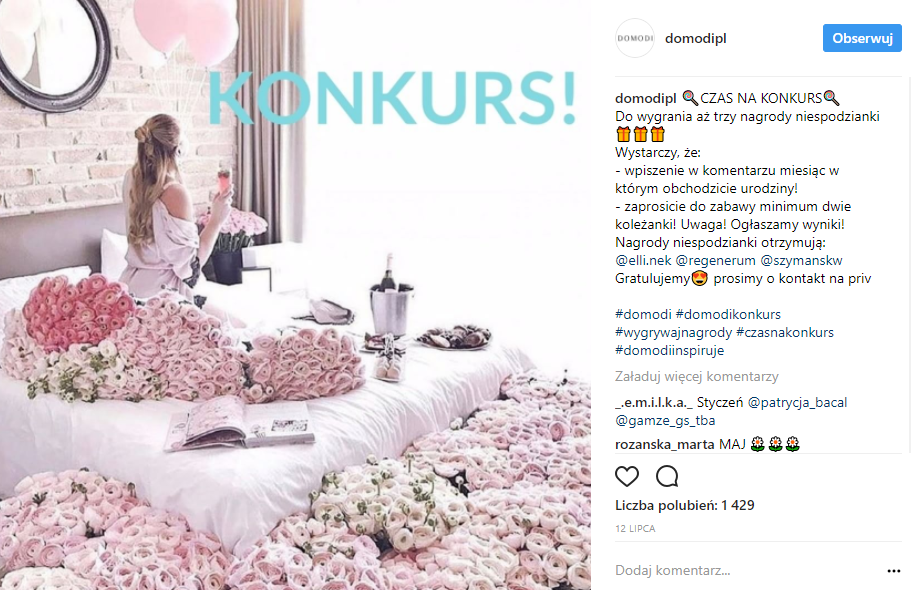 Również inne marki modowe pokusiły się w lipcu o zorganizowanie Instagramowych konkursów. Jedną z nich było Domodi, jednak ich konkurs rozniósł się znacznie mniejszym echem na Instagramie, osiągając jedynie niespełna 1500 serduszek i około 700 komentarzy.
