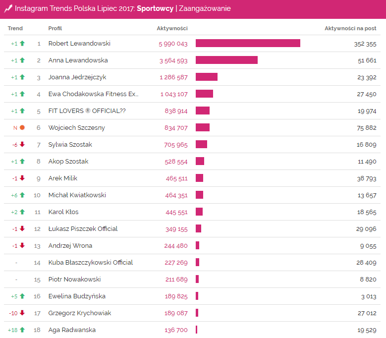 Instagram Trends Polska lipiec 2017 – Sportowcy | zaangażowanie