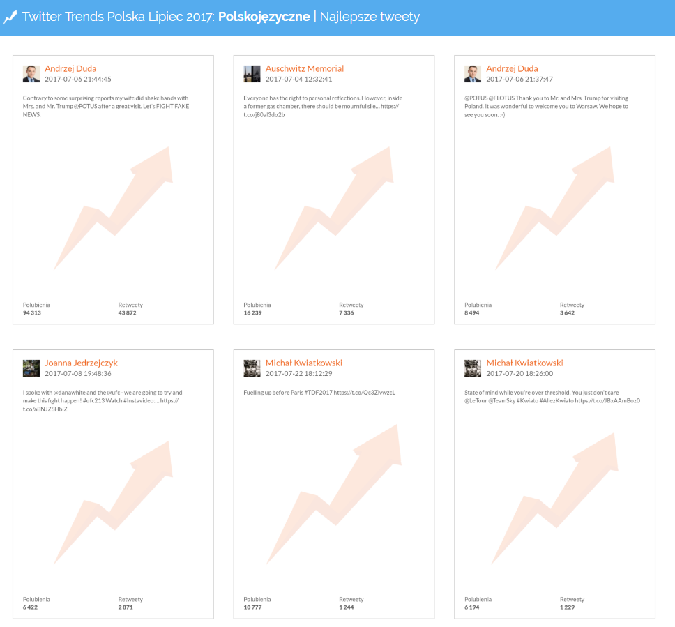 Najważniejszym wydarzeniem pierwszych dni lipca była niewątpliwie wizyta w Warszawie prezydenta USA Donalda Trumpa, której kulminacją było przemówienie na placu Krasińskich. Nie obyło się bez kontrowersji, viralem stał się GIF, na którym Agata Duda nie odwzajemnia uścisku dłoni amerykańskiego przywódcy, a kieruje się do jego żony. Tweet polskiego prezydenta, w którym zapewnia, że jednak do uścisku dłoni doszło i wzywa do walki z fake newsami stał się najpopularniejszym tweetem miesiąca. Polubiło go 95 tysięcy,a podało dalej 43 tysiące użytkowników Twittera.