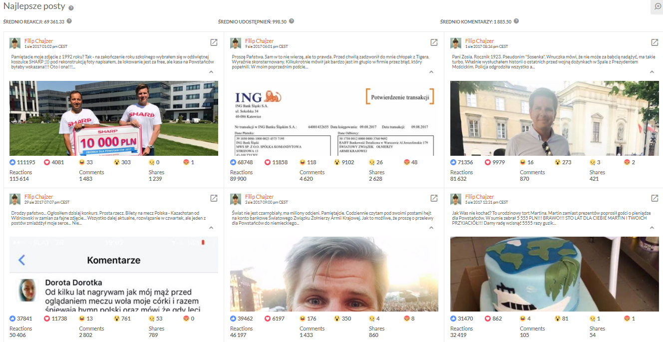 Wielką popularnością cieszą się od dawna posty oraz profile o wydźwięku empatycznym, które skłaniają nas do refleksji, zachęcają do pomocy innym. Niekiedy zdarza się, że stają się też viralami, o czym pisaliśmy już 2 miesiące temu. Jedną z osób, która od dawna wiedzie prym w tego typu działalności jest Filip Chajzer niejednokrotnie angażując się w różnego rodzaju akcje charytatywne i pomoc innym, ostatnio głównie Powstańcom Warszawskim. Czołówka najlepszych jego postów w sierpniu dotyczyła właśnie tego celu.