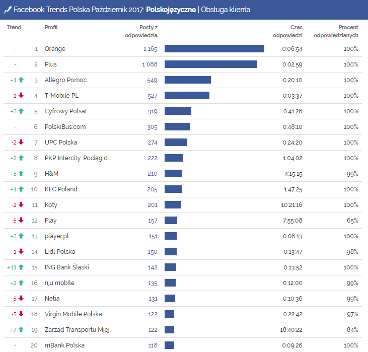 Branża telekomunikacyjna numerem 1. w kategorii Obsługa klienta na Facebooku, pażdziernik 2017