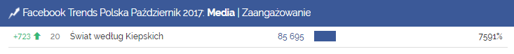Absolutnie na sam koniec kultowy już serial “Świat według Kiepskich”, którego Facebookowy profil w październiku “odżył” i odnotował wzrost aż o 723 pozycje w kategorii Zaangażowanie. Powód? Prosty. Rozpoczęcie transmisji nowych odcinków serialu.