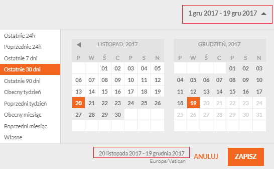 Po lewej stronie znajduje się lista, służąca do wyboru predefiniowanych zakresów dat (np. ostatnie 7 dni, ostatnie 30 dni czy poprzedni tydzień). Oczywiście w dalszym ciągu możemy indywidualnie wybierać daty, dla jakich chcemy uzyskać dane. Został jednak usprawniony mechanizm działania kalendarza – pierwsze kliknięcie oznacza datę początkową, zaś drugie końcową. Klikamy “zapisz” i gotowe!