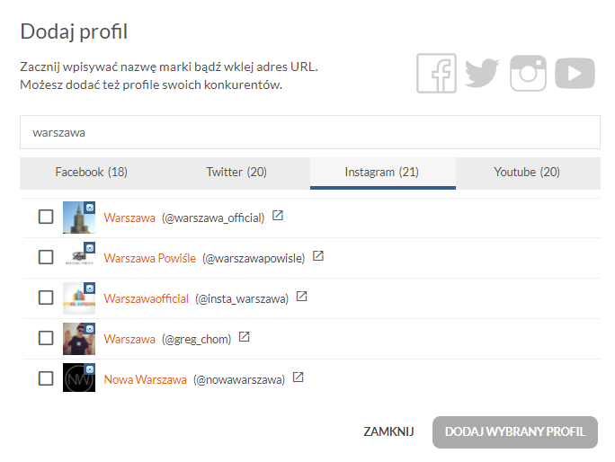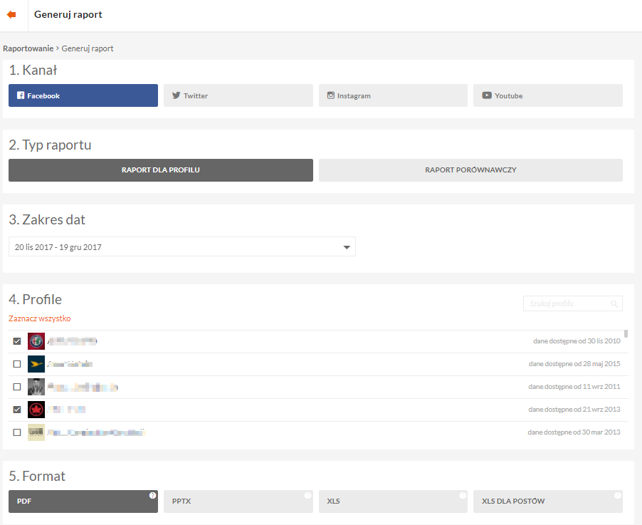 Zachowaliśmy przy tym możliwość generowania kilku raportów jednocześnie. W ramach jednego kanału i zaznaczonego okresu można stworzyć kilka raportów jednocześnie, wybierając odpowiednie profile na Twoim koncie.