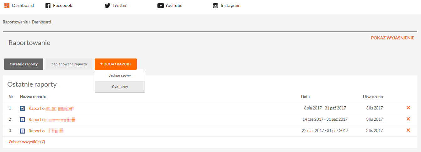 - zakładka Ostatnie raporty – tu znajduje się lista wszystkich raportów (jednorazowych oraz już wygenerowanych cyklicznych raportów),
