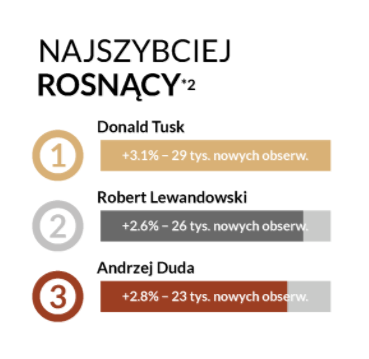 Oczywiście, polityka na polskim Twitterze jest bardzo mocna, ale musimy przyznać, że w listopadzie prawie całkowicie zdominowała to medium. Najszybciej rosły profile Andrzeja Dudy, Donalda Tuska i Roberta Lewandowskiego, którym przybyło odpowiednio 29, 23 i 26 tysięcy nowych obserwujących.
