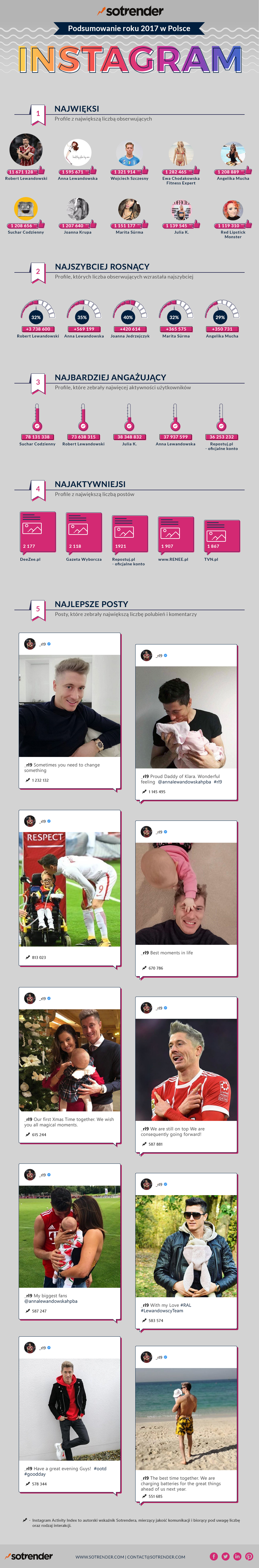 Patrząc na deklasującą rywali (w tym małżonkę 😉 ) liczbę fanów Roberta, jak i na zestawienie najlepszych postów 2017 roku, nie ma co do tego wątpliwości. Już nawet nasze comiesięczne zestawienia Instagram Trends były sygnałem, że piłkarz może namieszać w rocznym podsumowaniu aktywności na Instagramie.