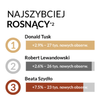 Najszybciej w ubiegłym miesiącu, poza Lewym, rosły konta Donalda Tuska oraz Beaty Szydło, której przybyło ponad 23 tysiące nowych obserwujących. Warto zauważyć, że tak duży przyrost nastąpił w miesiącu, w którym Beata Szydło pożegnała się z fotelem Prezesa Rady Ministrów.