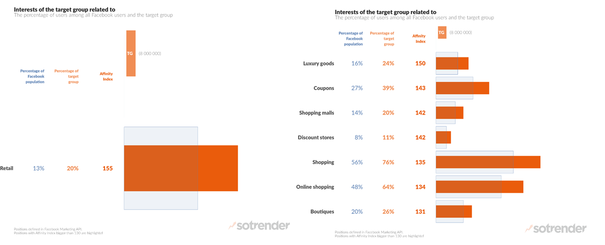 Z zebranych przez nas danych wynika, że polscy gracze kochają zakupy online, tu zaskoczenia nie ma. Co ciekawe jednak, zakupami w sieci interesują się dużo bardziej niż pozostali użytkownicy Facebooka, na co wskazuje bardzo wysoki Affinity Index.
