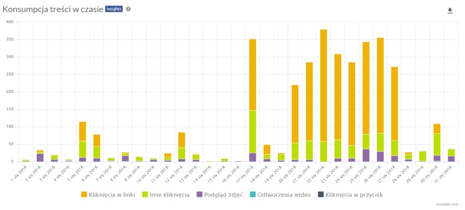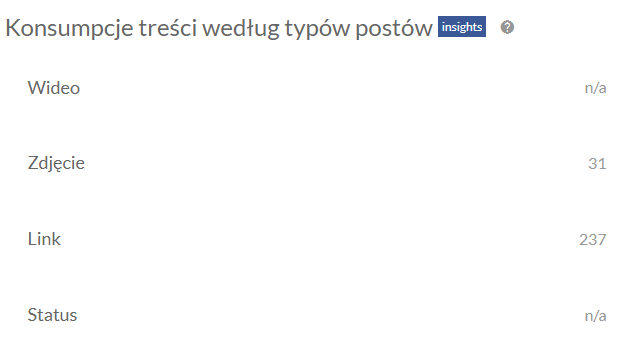 - Liczba konsumpcji z podziałem na rodzaj posta – zawierającego zdjęcie, wideo, linka bądź zwykły post tekstowy.