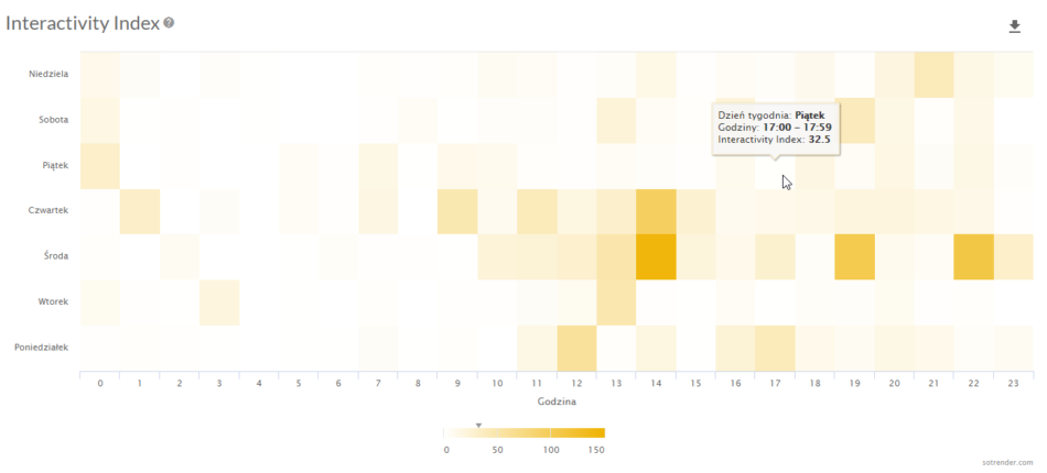 Heatmapa powstaje na podstawie Interactivity Index. Dla przypomnienia jest to zbiorczy, ważony wskaźnik wszystkich aktywności na profilu. Uwzględnia różne aktywności – polubienie, komentarz, wpis czy udostępnienie treści – które mają kolejno coraz wyższe wagi, zgodnie z ich coraz większą widocznością dla innych i coraz rzadszym występowaniem.