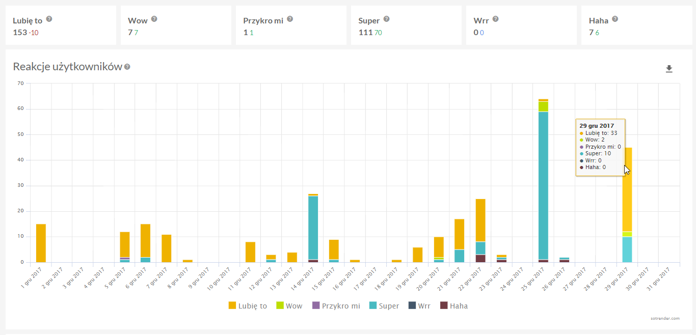 Czy wiesz jak odbiorcy reagują na Twoje treści? Od dziś możesz to sprawdzić w Sotrenderze! Na kolejnym nowym wykresie z łatwością sprawdzisz rozkład reakcji użytkowników na publikowane przez Stronę treści w czasie.
