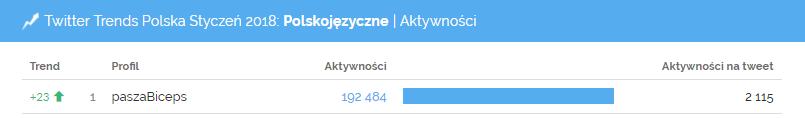 Wszystko to spowodowało, że paszaBiceps zebrał najwięcej aktywności użytkowników w styczniu i awansował w kategorii Aktywności aż o 23 pozycje. Sukces udało mu się chociaż odnieść na Twitterze 😉