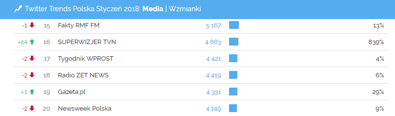 Wart odnotowania jest również duży awans profilu Superwizjer TVN jeśli chodzi o liczbę jego wzmianek przez użytkowników Twittera. W styczniu odnotował on wzrost aż o 64 pozycje w kategorii Media, z przyrostem wzmianek aż o 839%.