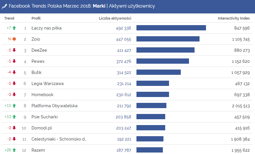 Marki o nawiększej liczbie aktywnych użytkowników w marcu na Facebooku