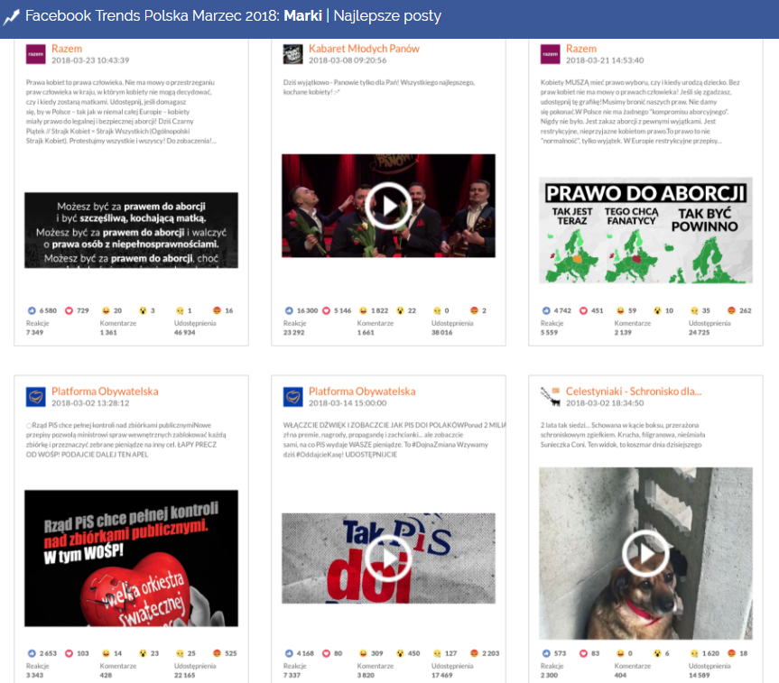 Choć cały czas silna na Twitterze, polityka wyjątkowo mocno angażowała użytkowników Facebooka w marcu. Głównymi tematami były prawa kobiet oraz propozycja nowych regulacji dot. zbiórek publicznych. Wyjątkowo głośno było również o kilku innych tematach społeczno-politycznych.