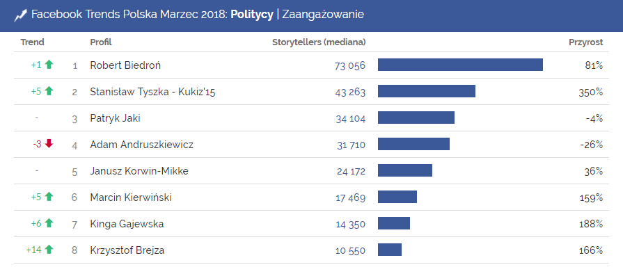 Profile polityków o największym zaangażowaniu na Facebooku w marcu