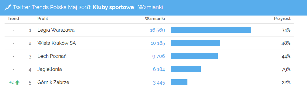 Maj był w tym roku bardzo piłkarskim miesiącem. Z jednej strony zakończyły się rozgrywki LOTTO Ekstraklasy, tytuł mistrzowski obroniła Legia Warszawa, a z drugiej – mistrzostwa świata w Rosji tuż za pasem. Nowy-stary mistrz kraju był najczęściej wspominanym klubem sportowym w ubiegłym miesiącu. Mundialowe wzmożenie widać zarówno wśród najlepszych tweetów miesiąca, gdzie królowały przygotowania Roberta Lewandowskiego do misji Rosja 2018 oraz w wyraźnych awansach polskich reprezentantów i prezesa PZPN Zbigniewa Bońka w rankingach zaangażowania.