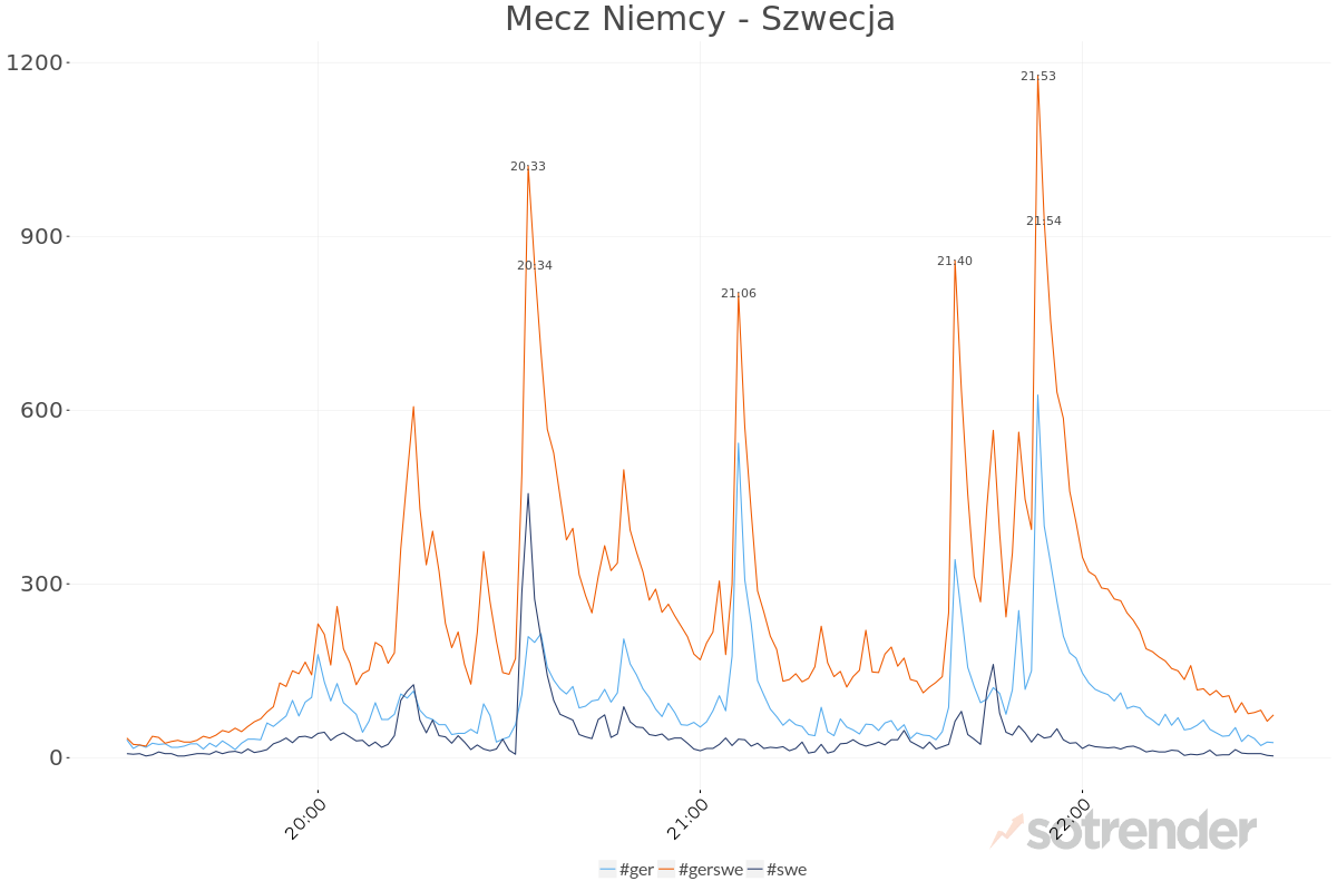 Przeanalizowaliśmy częstotliwość występowania tweetów z oficjalnymi hashtagami dla poszczególnych meczów oraz reprezentacji. Rozkład tweetów w każdym przypadku doskonale odzwierciedla przebieg spotkania, co widać już na przykładzie meczu otwierającego turniej: Rosja – Arabia Saudyjska.